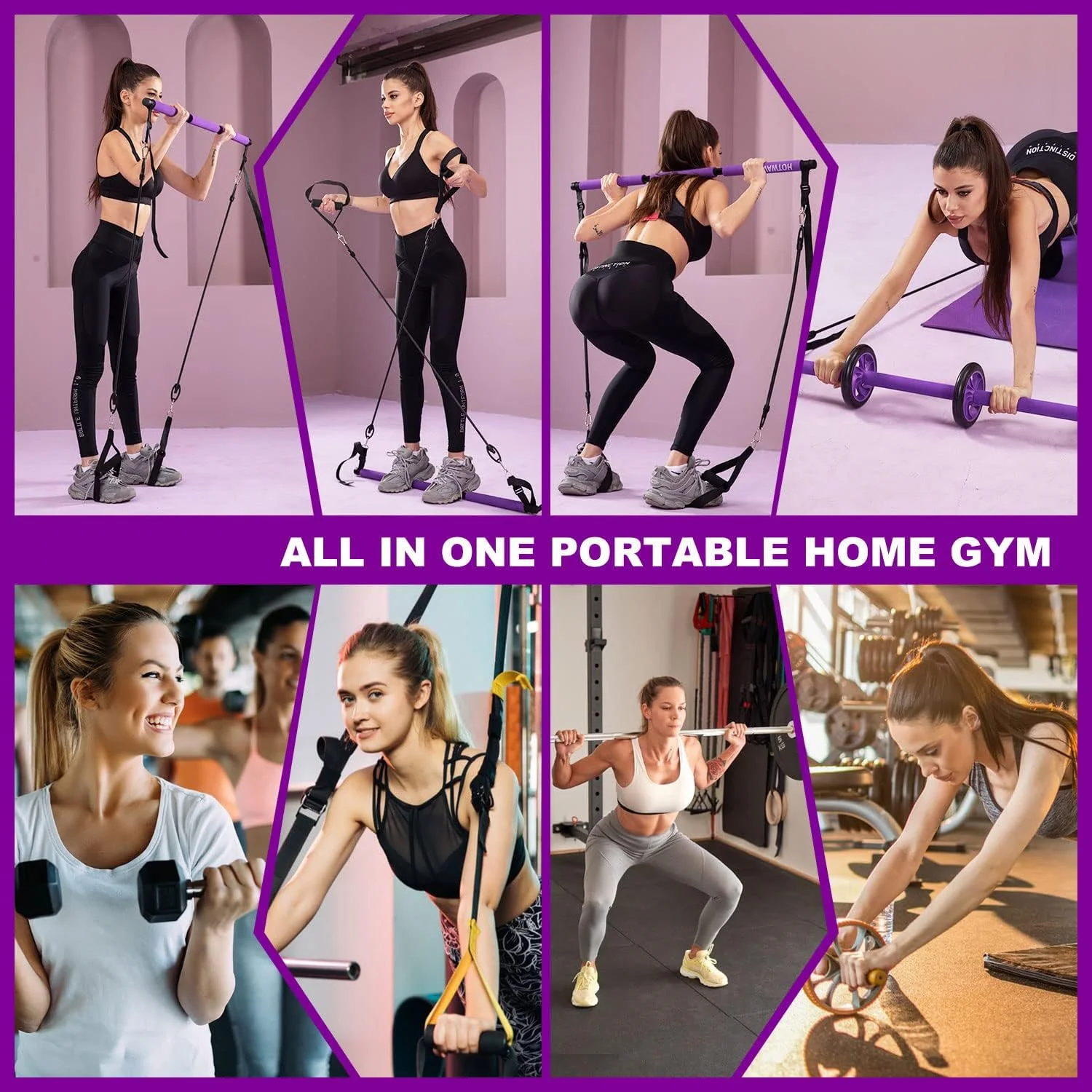 【Unique Exercise System】 can not only meet the upper and lower body exercise, but also can target core muscle strength training.     In particular, with the belly roller system, you can easily upgrade your abs with the cushioning protection of resistance bands, creating a perfect muscular line that no other Pilates bar can offer.     This can only be done with our unique three-bar structure.     This is the real ALL- IN -ONE system!