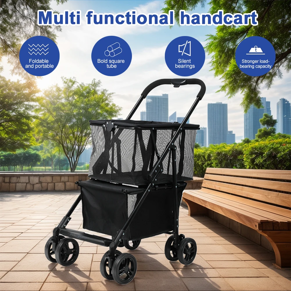 1.Dual-Layer Design: Our foldable shopping cart features a two-tier layout, combining a lightweight frame with ample storage space. This innovative structure allows for a significant capacity without compromising on portability, accommodating all your shopping, picnicking, and camping needs with ease.